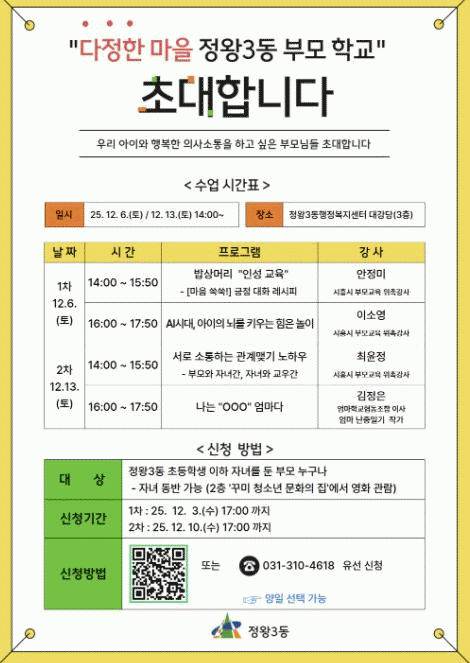 [NWS¹æ¼Û=Çѽ¸ñ ±âÀÚ]½ÃÈï½Ã Á¤¿Õ3µ¿ ÇàÁ¤º¹Áö¼¾ÅÍ´Â ¿À´Â 12¿ù 6Àϰú 13ÀÏ ¾çÀϰ£, ÀÚ³à¿ÍÀÇ ¿Ã¹Ù¸¥ ÀÇ»ç¼ÒÅë ¹æ¹ýÀ» ¹è¿ì°í ºÎ¸ð ¿ªÇÒ¿¡ ´ëÇÑ ÀڽۨÀ» ³ôÀÏ ¼ö ÀÖ´Â ¡®´ÙÁ¤ÇÑ ¸¶À» Á¤¿Õ3µ¿ ºÎ¸ðÇб³¡¯¸¦ ¿î¿µÇÑ´Ù. ±³À° ´ë»óÀº Ãʵ