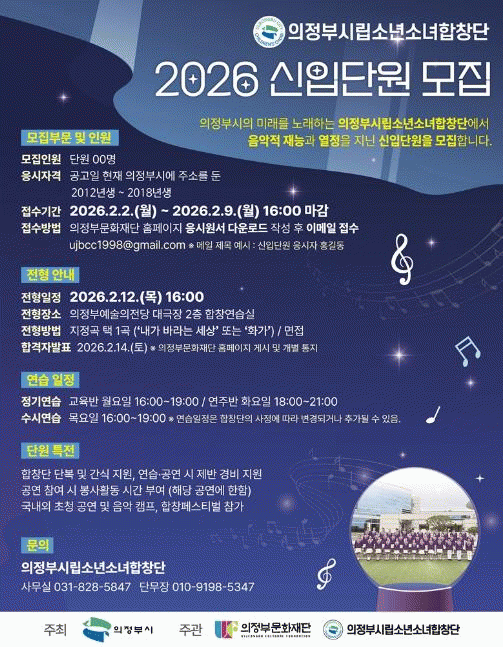 [NWS¹æ¼Û=Çѽ¸ñ ±âÀÚ]ÀÇÁ¤ºÎ½Ã´Â À½¾Ç¿¡ °ü½É ÀÖ´Â ¾Æµ¿¡¤Ã»¼Ò³âÀ» ´ë»óÀ¸·Î ½Ã¸³¼Ò³â¼Ò³àÇÕâ´Ü ½ÅÀÔ´Ü¿øÀ» 2¿ù 2ÀϺÎÅÍ 9ÀϱîÁö ¸ðÁýÇÑ´Ù°í ¹àÇû´Ù. ¸ðÁý ´ë»óÀº ÀÇÁ¤ºÎ½Ã¿¡ °ÅÁÖÇÏ´Â 2012³âºÎÅÍ 2018³â»ý ¾Æµ¿¡¤Ã»¼Ò³âÀ¸·Î, À½¾Ç¿¡ ¡¦