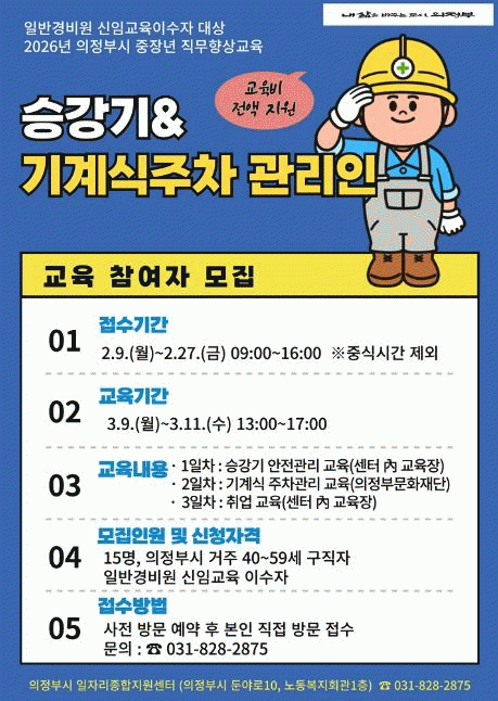 [NWS¹æ¼Û=Çѽ¸ñ ±âÀÚ]ÀÇÁ¤ºÎ½Ã´Â ÁßÀå³âÃþÀÇ Ãë¾÷ ¿ª·®À» ³ôÀ̱â À§ÇÑ ¡®½Â°­±â¡¤±â°è½ÄÁÖÂ÷ °ü¸®ÀÎ ±³À°¡¯ Âü¿©ÀÚ¸¦ ¸ðÁýÇÑ´Ù. Áö¿ª ÁßÀå³âÃþÀÇ Á÷¹« Àü¹®¼º°ú Ãë¾÷ °æÀï·ÂÀ» ³ôÀ̱â À§ÇÑ À̹ø ±³À°Àº 3¿ù 9ÀϺÎÅÍ 11ÀϱîÁö ÀÇÁ¤ºÎ½Ã ¡¦