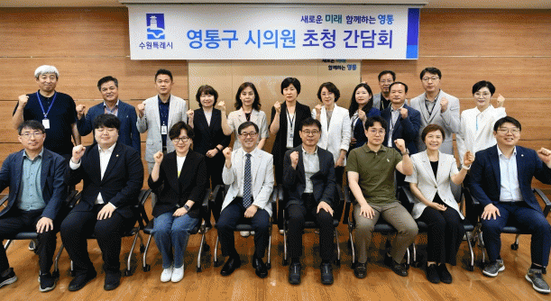 [NWS¹æ¼Û=Çѽ¸ñ ±âÀÚ]¼ö¿ø½Ã ¿µÅ뱸´Â 21ÀÏ ÇϹݱ⠽ÃÀÇ¿ø °£´ãȸ¸¦ ¿­°í Áö¿ª Çö¾È°ú ±¸Á¤ ¿î¿µ ¹æÇâÀ» ³íÀÇÇß´Ù. À̳¯ °£´ãȸ¿¡´Â Àå¼ö¼® ¿µÅ뱸ûÀåÀ» ºñ·ÔÇØ ¿µÅ뱸 Áö¿ª ½ÃÀÇ¿ø, °¢ ºÎ¼­Àå µî 20¿© ¸íÀÌ Âü¼®ÇØ ÁֹΠ»ýȰ°ú ¹ÐÁ¢¡¦