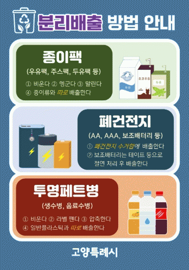 [NWS¹æ¼Û=Çѽ¸ñ ±âÀÚ]°í¾çƯ·Ê½Ã´Â ½Ã¹Îµé¿¡°Ô 3´ë ÀçȰ¿ëǰ(Æó°ÇÀüÁö¡¤Á¾ÀÌÆÑ¡¤Åõ¸íÆäÆ®º´)À» ¹Ýµå½Ã ºÐ¸® ¹èÃâÇØ ÁÙ °ÍÀ» ´çºÎÇß´Ù. ½Ã´Â µ¿ ÇàÁ¤º¹Áö¼¾Å͸¦ ÅëÇØ 3´ë ÀçȰ¿ëǰ ±³È¯»ç¾÷À» »ó½Ã ¿î¿µÇϰí ÀÖ¾î, ½Ã¹ÎµéÀº ¾ðÁ¦µçÁö ±³¡¦