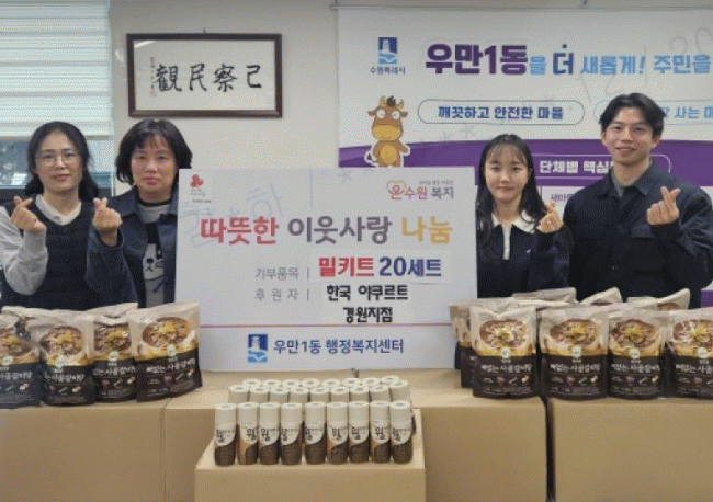 [NWS¹æ¼Û=Çѽ¸ñ ±âÀÚ]¼ö¿ø½Ã ÆÈ´Þ±¸ ¿ì¸¸1µ¿ ÇàÁ¤º¹Áö¼¾ÅÍ´Â Áö³­ 20ÀÏ, Çѱ¹¾ßÄí¸£Æ® °æ¿øÁöÁ¡À¸·ÎºÎÅÍ °¥ºñÅÁ, ¼ÒºÒ°í±â¶±ººÀÌ, ¹ßÈ¿À¯ µî ´Ù¾çÇÑ Áï¼®Á¶¸®½ÄǰÀ» Àü´Þ¹Þ¾Ò´Ù. À̹ø ÈÄ¿øÀº Áö¿ª ³» ¾î·Á¿î ÀÌ¿ôµé¿¡°Ô µû¶æÇÑ ¸¶À½À» Àü¡¦