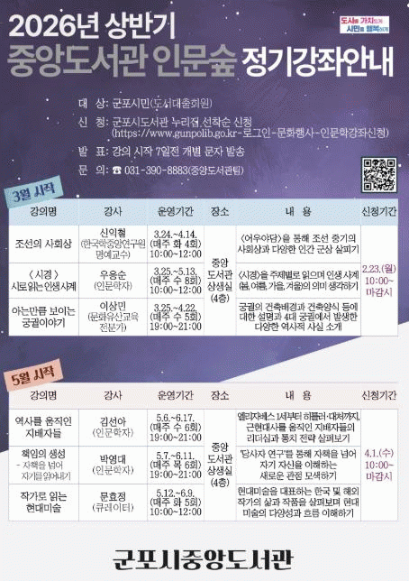 [NWS¹æ¼Û=Çѽ¸ñ ±âÀÚ]±ºÆ÷½ÃÁß¾Óµµ¼­°üÀº ½Ã¹ÎÀÇ Àι®ÇÐÀû ¼Ò¾çÀ» ÇÔ¾çÇÏ°í °øµ¿Ã¼Àû ¼ºÂûÀÇ ±âȸ¸¦ È®´ëÇϰíÀÚ ¡®Áß¾Óµµ¼­°ü Àι®½£¡¯ »ó¹Ý±â °­Á¸¦ ¿î¿µÇÑ´Ù. À̹ø °­Á´ 3¿ù°ú 5¿ù °¢ 3°­Á¾¿ 6°³ °­Á·Î, ¿ÀÀü(10½Ã)°ú Àú³á(19½Ã¡¦