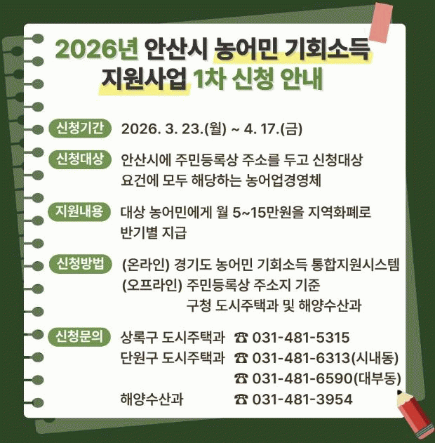 [»çȸ] ¾È»ê½Ã, '³ó¾î¹Î ±âȸ¼Òµæ Áö¿ø»ç¾÷' 1Â÷ ½Åû Á¢¼ö |2026. 03.17