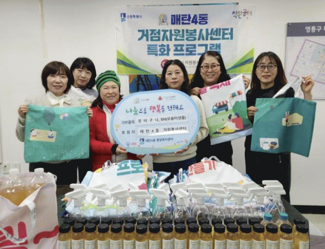 [NWS¹æ¼Û=Çѽ¸ñ ±âÀÚ]¼ö¿ø½Ã ¸Åź4µ¿ ÀÚ¿øºÀ»çÄ·ÇÁ ÄÚÄ¡¿Í ºÀ»çȸ¿øµéÀº Áö³­ 12¿ù 19ÀÏ, Áö¿ª »ó±Ç Ȱ¼ºÈ­¿Í ¸¶À» °øµ¿Ã¼ Ȱ¼ºÈ­¸¦ À§ÇØ È¸¿øµéÀÌ Á÷Á¢ ¸¸µç Àå¹Ù±¸´Ï¿Í EM(À¯¿ë ¹Ì»ý¹°)À» ¸Åź4µ¿ ÇàÁ¤º¹Áö¼¾ÅÍ¿¡ Àü´ÞÇß´Ù. À̳¯ Àü´Þ¡¦