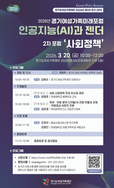 [»çȸ] °æ±âµµ¿©¼º°¡Á·Àç´Ü, 20ÀÏ 2Â÷ °æ±â¿©¼º°¡Á·¹Ì·¡Æ÷·³¡¦'ÀΰøÁö´É°ú »çȸÁ¤Ã¥' |2026. 03.17