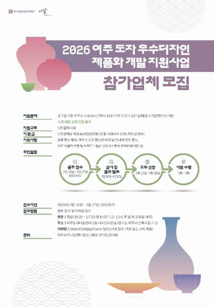 [»çȸ] ¿©ÁÖ¼¼Á¾¹®È­°ü±¤Àç´Ü, '2026 ¿©ÁÖ µµÀÚ ¿ì¼öµðÀÚÀÎ Á¦Ç°È­ °³¹ß Áö¿ø»ç¾÷' Âü°¡¾÷ü ¸ðÁý |2026. 02.12