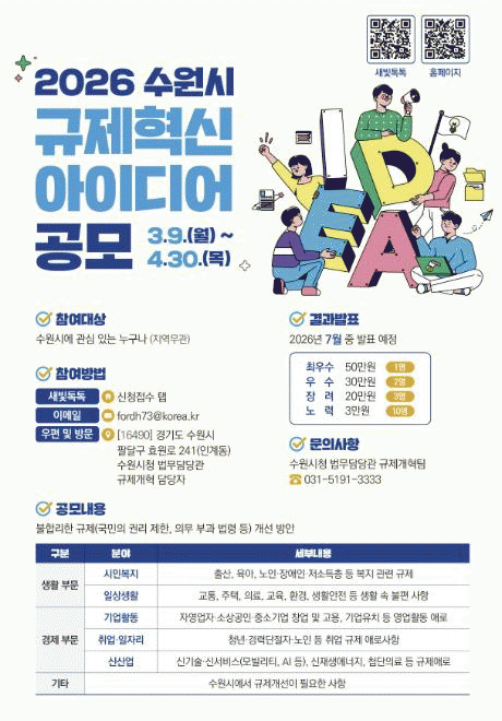 [NWS¹æ¼Û=Çѽ¸ñ ±âÀÚ]¼ö¿øÆ¯·Ê½Ã°¡ 9ÀϺÎÅÍ 4¿ù 30ÀϱîÁö ¡®2026 ±ÔÁ¦Çõ½Å ¾ÆÀ̵ð¾î¡¯¸¦ °ø¸ðÇÑ´Ù. »ýȰ ¼Ó ºÒÇÕ¸®ÇÑ ±ÔÁ¦(¹ý·É¡¤Á¦µµ¡¤±ÔÁ¤ µî)¸¦ °³¼±ÇÒ ¾ÆÀ̵ð¾î¸¦ ÀÀ¸ðÇÏ¸é µÈ´Ù. Áö¿ª°ú »ó°ü¾øÀÌ ¼ö¿ø½Ã¿¡ °ü½É ÀÖ´Â ±¹¹Î, °øÁ÷ÀÚ¡¦