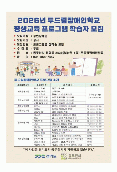 [»çȸ] µ¿µÎõ½Ã µÎµå¸²Àå¾ÖÀÎÇб³, 2026Çг⵵ Æò»ý±³À° ÇÁ·Î±×·¥ ÇнÀÀÚ ¸ðÁý |2026. 03.13