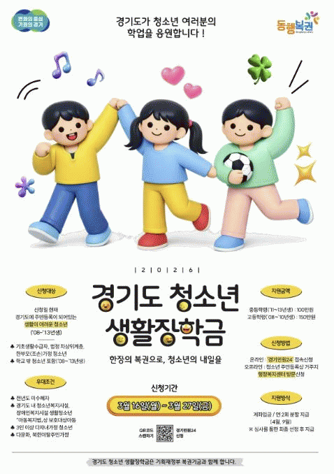 [NWS¹æ¼Û=Çѽ¸ñ ±âÀÚ]µ¿µÎõ½Ã´Â º¹±Ç±â±ÝÀ» Àç¿øÀ¸·Î ÇÏ´Â ¡®2026³â °æ±â û¼Ò³â »ýȰÀåÇбݡ¯ ½ÅûÀ» ¿À´Â 3¿ù 16ÀϺÎÅÍ 3¿ù 27ÀϱîÁö ¹Þ´Â´Ù°í ¹àÇû´Ù. ÀÌ »ç¾÷Àº µµ³» »ýȰÀÌ ¾î·Á¿î û¼Ò³âµé¿¡°Ô ¾ÈÁ¤ÀûÀÎ ±³À° ȯ°æÀ» Á¦°øÇϱâ À§¡¦