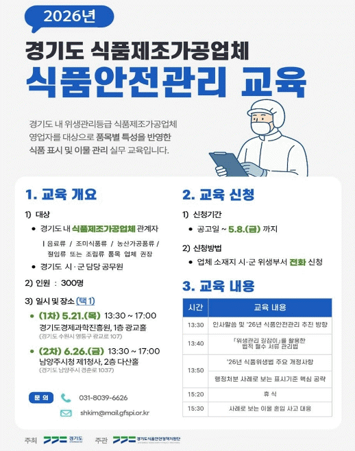 [»çȸ] °æ±âµµ, µµ³» ½ÄǰÁ¦Á¶¡¤°¡°ø¾÷ü ´ë»ó À§»ý°ü¸®±³À° Âü¿©ÀÚ ¸ðÁý |2026. 04.20