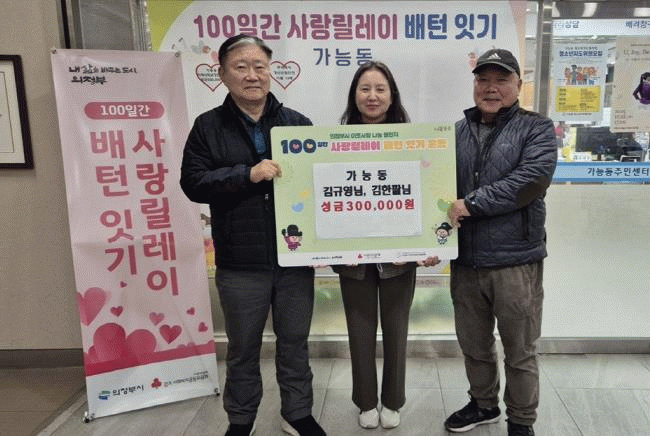 [NWS¹æ¼Û=Çѽ¸ñ ±âÀÚ]ÀÇÁ¤ºÎ½Ã °¡´Éµ¿Áֹμ¾ÅÍ´Â 11¿ù 11ÀÏ °¡´Éµ¿ ÁÖ¹ÎÀÚġȸ ±è±Ô¿µ À§¿øÀÌ 10¸¸ ¿ø, ±èÇÑÆÈ À§¿øÀÌ 20¸¸ ¿øÀ» °¢°¢ ±âŹÇÏ¸ç °ü³» Ãë¾à°èÃþ ³ëÀÎÀ» µ½±â À§ÇÑ ¡®100Àϰ£ »ç¶û¸±·¹ÀÌ ¹èÅÏ Àձ⡯¿¡ µ¿ÂüÇß´Ù°í ¹àÇû´Ù.¡¦
