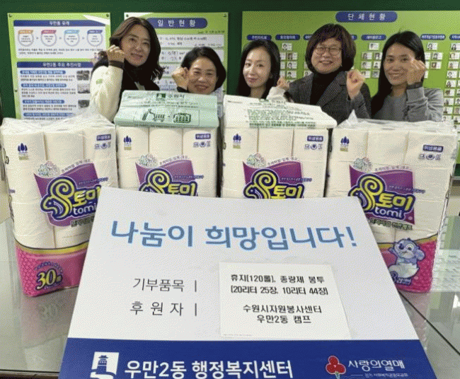 [NWS¹æ¼Û=Çѽ¸ñ ±âÀÚ]¼ö¿ø½Ã ÆÈ´Þ±¸ ¿ì¸¸2µ¿Àº Áö³­ 12ÀÏ, ¼ö¿ø½ÃÀÚ¿øºÀ»ç¼¾ÅÍ ¿ì¸¸2µ¿ Ä·ÇÁ·ÎºÎÅÍ ÈÞÁö¿Í Á¾·®Á¦ ºÀÅõ ±âºÎ¸¦ Àü´Þ¹Þ´Â ¶æ±íÀº ½Ã°£À» °¡Á³´Ù. À̹ø¿¡ ±âºÎµÈ ¹°Ç°Àº ¡ãµÎ·ç¸¶¸® ÈÞÁö 120·Ñ ¡ãÁ¾·®Á¦ ºÀÅõ(20L 25Àå, 1¡¦