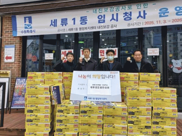 [»çȸ] ¼ö¿ø½Ã ±Ç¼±±¸ ¼¼·ù1µ¿ ¼¼·ù¼¾Æ®·²ÇÑÀÇ¿ø, ¿¬¸» ¸Â¾Æ Áö¿ª»çȸ Ãë¾à°èÃþ¿¡ ¶ó¸é 100¹Ú½º Àü´Þ |2025. 12.22