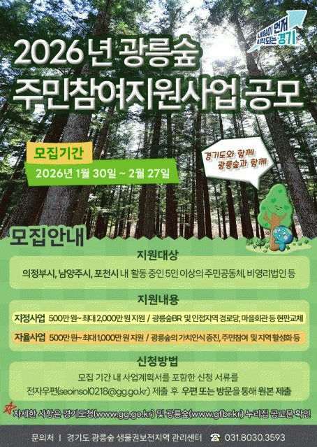 [NWS¹æ¼Û=Çѽ¸ñ ±âÀÚ]°æ±âµµ°¡ ±¤¸ª½£ »ý¹°±Çº¸ÀüÁö¿ª Ȱ¼ºÈ­¸¦ À§ÇØ 2026³â ±¤¸ª½£ ÁÖ¹ÎÂü¿©Áö¿ø»ç¾÷ Âü¿©ÀÚ¸¦ ¸ðÁýÇÑ´Ù. ±¤¸ª½£ »ý¹°±Çº¸ÀüÁö¿ª ÁÖ¹ÎÂü¿©Áö¿ø»ç¾÷Àº ÀÇÁ¤ºÎ½Ã, ³²¾çÁÖ½Ã, Æ÷õ½Ã ³»¿¡¼­ Ȱµ¿Çϰí ÀÖ´Â 5ÀÎ ÀÌ»óÀÇ ÁֹΡ¦