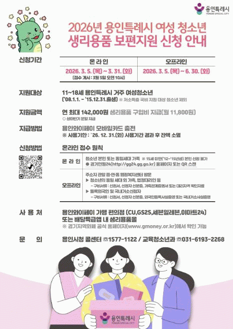 [»çȸ] ¿ëÀÎÆ¯·Ê½Ã, ¿©¼º û¼Ò³â »ý¸®¿ëǰ º¸ÆíÁö¿ø»ç¾÷ ½Åû Á¢¼ö |2026. 03.05