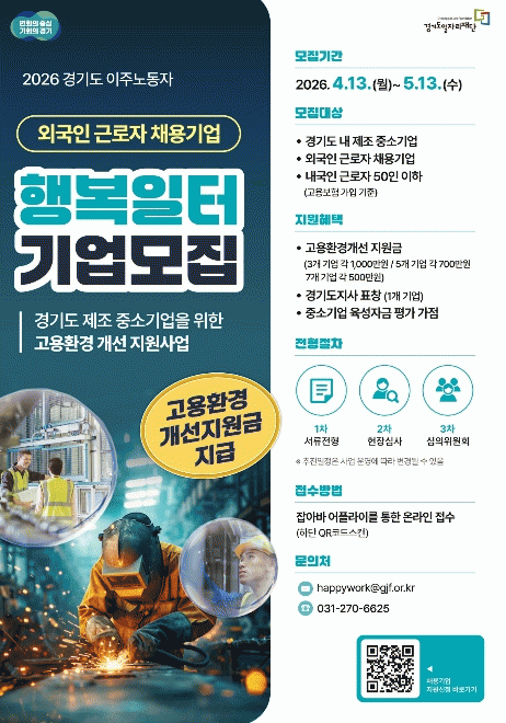 [NWS¹æ¼Û=Çѽ¸ñ ±âÀÚ]°æ±âµµ¿Í °æ±âµµÀÏÀÚ¸®Àç´ÜÀº µµ³» ¿Ü±¹ÀÎ ±Ù·ÎÀÚ¸¦ °í¿ëÇÑ Áß¼Ò Á¦Á¶±â¾÷À» ´ë»óÀ¸·Î ¡®2026³â °æ±âµµ ÀÌÁֳ뵿ÀÚ ÇູÀÏÅÍ ¼±Á¤»ç¾÷¡¯ Âü¿©±â¾÷À» ¸ðÁýÇÑ´Ù°í 20ÀÏ ¹àÇû´Ù. ÀÌ »ç¾÷Àº ¿Ü±¹ÀÎ ±Ù·ÎÀÚÀÇ ³ëµ¿¾ÈÀü°ú¡¦