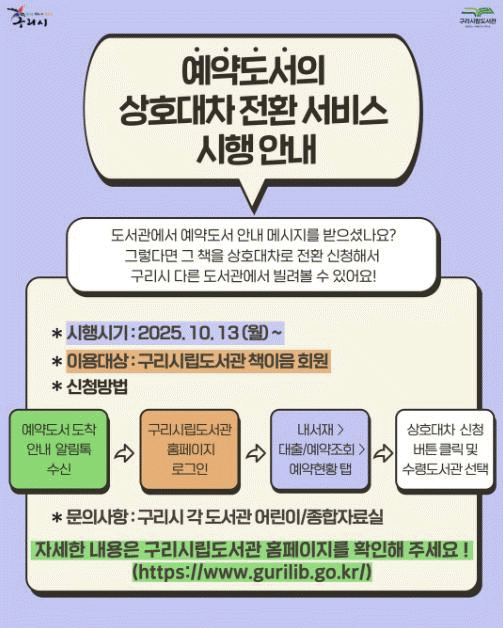 [»çȸ] "ÀÌÁ¦ °¡±î¿î µµ¼­°ü¿¡¼­ Ã¥À» ¸¸³ª¿ä" ±¸¸®½Ã, ¿¹¾à µµ¼­ »óÈ£´ëÂ÷ ¼­ºñ½º ½ÃÇà |2025. 10.10
