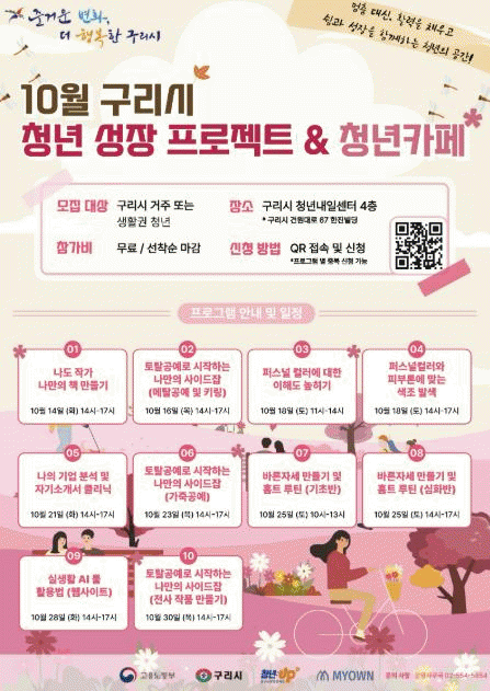 [NWS¹æ¼Û=Çѽ¸ñ ±âÀÚ]±¸¸®½Ã´Â °í¿ë³ëµ¿ºÎ °ø¸ð»ç¾÷¿¡ ¼±Á¤µÅ 4¿ùºÎÅÍ ÃßÁø ÁßÀΡ®2025³â ±¸¸®½Ã û³â ¼ºÀåÇÁ·ÎÁ§Æ®¡¯ÀÇ 10¿ù ÇÁ·Î±×·¥ Âü¿©ÀÚ¸¦ 10¿ù 30ÀÏ ¿ÀÈÄ 1½Ã±îÁö ¸ðÁýÇÑ´Ù°í ¹àÇû´Ù. À̹ø ÇÁ·ÎÁ§Æ®´Â Áö¿ª û³âµéÀÇ Ãë¾÷ °æÀï·Â¡¦