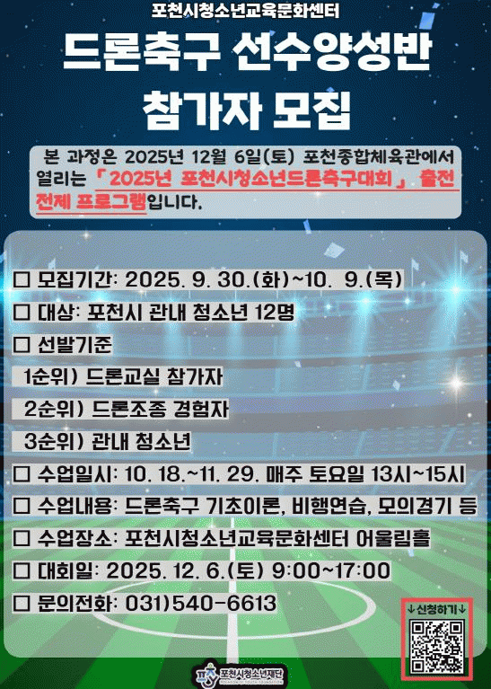 [»çȸ] Æ÷õ½Ãû¼Ò³â±³À°¹®È­¼¾ÅÍ, µå·ÐÃ౸ ¼±¼ö¾ç¼º¹Ý Âü°¡ û¼Ò³â ¸ðÁý |2025. 10.10