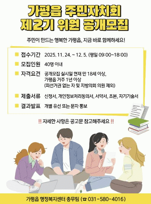 [NWS¹æ¼Û=Çѽ¸ñ ±âÀÚ]°¡Æò±º °¡ÆòÀ¾ÀÌ ÁֹΠÁÖµµ ¸¶À»°èȹ°ú Çö¾È ÇØ°á¿¡ Âü¿©ÇÒ Á¦2±â ÁÖ¹ÎÀÚġȸ À§¿øÀ» °ø°³ ¸ðÁýÇÑ´Ù. Á¢¼ö´Â 11¿ù 24ÀϺÎÅÍ 12¿ù 5ÀϱîÁö 12Àϰ£À̸ç, °¡ÆòÀ¾ ÇàÁ¤º¹Áö¼¾ÅÍ Ãѹ«ÆÀ¿¡ ½ÅûÇÏ¸é µÈ´Ù. ¸ðÁý ÀοøÀº 4¡¦