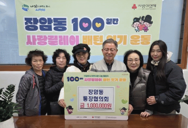 [NWS¹æ¼Û=Çѽ¸ñ ±âÀÚ]ÀÇÁ¤ºÎ½Ã Àå¾Ïµ¿Áֹμ¾ÅÍ´Â 11¿ù 19ÀÏ Àå¾Ïµ¿ ÅëÀåÇùÀÇȸ°¡ ¼º±Ý 100¸¸ ¿øÀ» Àü´ÞÇÏ¸ç ¡®100Àϰ£ »ç¶û¸±·¹ÀÌ ¹èÅÏ Àձ⡯¿¡ ÈûÀ» º¸ÅÉ´Ù°í ¹àÇû´Ù. Àå¾Ïµ¿ ÅëÀåÇùÀÇȸ´Â Áö¿ª Çà»ç Âü¿© ºÀ»çȰµ¿, º¹Áö À§±â°¡±¸ ¹ß¡¦