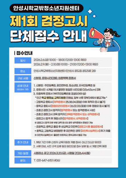 [»çȸ] ¾È¼º½ÃÇб³¹Ûû¼Ò³âÁö¿ø¼¾ÅÍ, Á¦1ȸ °ËÁ¤°í½Ã ´Üü¿ø¼­Á¢¼ö |2026. 02.05