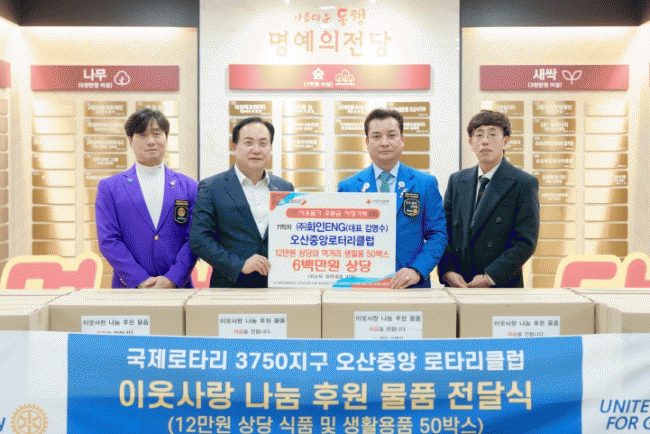 [NWS¹æ¼Û=Çѽ¸ñ ±âÀÚ]¿À»ê½Ã´Â Áö³­ 13ÀÏ ¿À»êÁß¾Ó·ÎÅ͸®Å¬·´(ȸÀå ±è°üÇö) ¼Ò¼Ó ¢ßÈ­ÀÎENG(´ëÇ¥ ±è¿µ¼ö)°¡ ´ÙÀÚ³à Àú¼Òµæ°¡Á¤À» Áö¿øÇϱâ À§ÇØ ÃÑ 600¸¸ ¿ø »ó´çÀÇ ¸Ô°Å¸® ¹× »ýÇÊǰ 50¹Ú½º¸¦ ±âŹÇß´Ù°í ¹àÇû´Ù. À̹ø ÈÄ¿øÀº Áö¿ª ³»¡¦