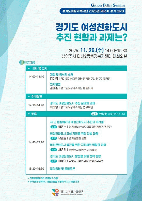 [NWS¹æ¼Û=Çѽ¸ñ ±âÀÚ]°æ±âµµ¿Í °æ±âµµ¿©¼º°¡Á·Àç´Ü Á¨´õÆø·ÂÅëÇÕ´ëÀÀ´ÜÀº 26ÀÏ ¿ÀÀü 10½Ã ¡®Áö¼Ó°¡´ÉÇÑ Á¨´õÆø·Â ÅëÇÕ´ëÀÀÀÇ °úÁ¦¿Í ºñÀü¡¯À» ÁÖÁ¦·Î 2025³â Á¦2Â÷ Á¤Ã¥¶ó¿îµå Å×À̺íÀ» °³ÃÖÇÑ´Ù. ¿Â¶óÀÎÀ¸·Î ÁøÇàµÇ´Â À̹ø Á¤Ã¥¶ó¿îµå¡¦