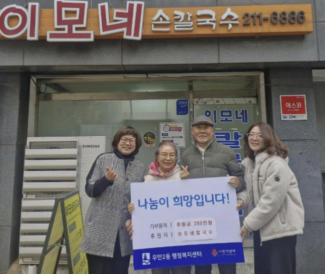 [NWS¹æ¼Û=Çѽ¸ñ ±âÀÚ]¼ö¿ø½Ã ÆÈ´Þ±¸ ¿ì¸¸2µ¿Àº Áö³­ 23ÀÏ, À̸ð³×Ä®±¹¼ö¿Í ÇÔ²² ÀÌ¿ô³ª´® ÈÄ¿ø±Ý Àü´Þ½ÄÀ» ÁøÇàÇß´Ù°í ¹àÇû´Ù. ÀÌ Àü´Þ½ÄÀº ¾î·Á¿î ÀÌ¿ôµéÀÌ º¸´Ù µû¶æÇÑ °Ü¿ïÀ» º¸³¾ ¼ö ÀÖµµ·Ï Çϱâ À§ÇØ ¸¶·ÃµÆÀ¸¸ç, Áö¿ª ³» Ȧ¸ö¾î¸£¡¦