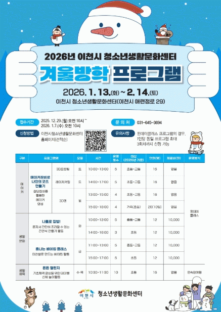 [NWS¹æ¼Û=Çѽ¸ñ ±âÀÚ]ÀÌõ½Ã û¼Ò³â»ýȰ¹®È­¼¾ÅͰ¡ 2026³â Á¤½Ä ¿î¿µÀ» ¾ÕµÎ°í, °ü³» û¼Ò³âµéÀÇ ¾ËÂù °Ü¿ï¹æÇÐÀ» Áö¿øÇϱâ À§ÇØ 1¿ù 13ÀϺÎÅÍ 2¿ù 14ÀϱîÁö ¡®2026³â °Ü¿ï¹æÇÐ ÇÁ·Î±×·¥¡¯À» ¿î¿µÇÑ´Ù°í ¹àÇû´Ù. À̹ø ÇÁ·Î±×·¥Àº ¹æÇÐ ¡¦