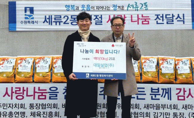 [NWS¹æ¼Û=Çѽ¸ñ ±âÀÚ]Áö³­ 11ÀÏ, ¼ö¿ø½Ã ±Ç¼±±¸ ¼¼·ùµ¿¿¡ ¼ÒÀçÇÑ ´ëÀϽǾ÷(ÁÖ)´Â ¼³ ¸íÀýÀ» ¸ÂÀÌÇÏ¿© Ãë¾à°èÃþÀ» À§ÇÑ ¹é¹Ì(10kg) 25Æ÷¸¦ ¼¼·ù2µ¿ ÇàÁ¤º¹Áö¼¾ÅÍ¿¡ ±âºÎÇß´Ù. ´ëÀϽǾ÷(ÁÖ)´Â ¸Å³â ¸íÀý¸¶´Ù »ç¶û ³ª´®À» ½ÇõÇϰí ÀÖÀ¸¸ç¡¦