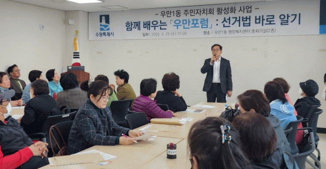 [»çȸ] ¼ö¿ø½Ã ÆÈ´Þ±¸ ¿ì¸¸1µ¿ ÁÖ¹ÎÀÚġȸ, 'Á¦1ȸ ¿ì¸¸Æ÷·³: ¼±°Å¹ý ¹Ù·Î¾Ë±â' °³ÃÖ |2026. 03.26
