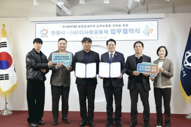[NWS¹æ¼Û=Çѽ¸ñ ±âÀÚ]¾È¾ç½Ã´Â 30ÀÏ ¿ÀÀü 10½Ã ½Ãû 3Ãþ Á¢°ß½Ç¿¡¼­ (»ç)´Ù»ç¶û°øµ¿Ã¼¿Í ¡®ÁÖ°ÅÃë¾à°èÃþ °ø°øÀÓ´ëÁÖÅà ÀÔÁÖº¸Áõ±Ý Áö¿øÀ» À§ÇÑ ¾÷¹«Çù¾à¡¯À» ü°áÇß´Ù. À̹ø Çù¾àÀº ÇÑÆÄ ´ëºñ ÁÖ°ÅÃë¾à°èÃþÀ» ÁýÁß ¹ß±¼ÇÏ´Â °úÁ¤¿¡¼­ °ø¡¦