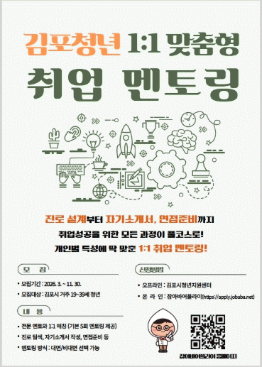 [°æÁ¦] ±èÆ÷½Ã, û³â 1:1 ¸ÂÃãÇü Ãë¾÷ ¸àÅ丵 Âü¿©ÀÚ ¸ðÁý |2026. 03.04