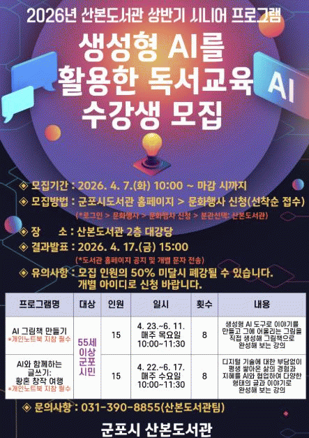 [»çȸ] ±ºÆ÷½Ã »êº»µµ¼­°ü, ½Ã´Ï¾î ´ë»ó '»ý¼ºÇü AI Ȱ¿ë µ¶¼­±³À°' ¿î¿µ |2026. 03.18