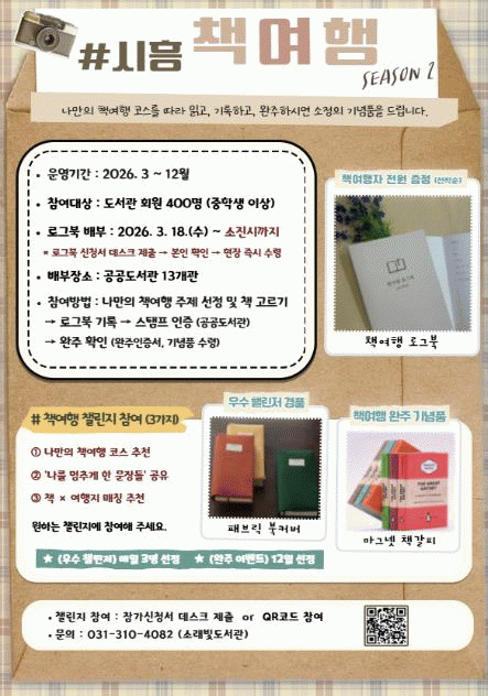 [NWS¹æ¼Û=Çѽ¸ñ ±âÀÚ]½ÃÈï½Ãµµ¼­°üÀº ½Ã¹ÎÀÇ µ¶¼­ ½ÇõÀ» Áö¿øÇϰí ÀÏ»ó ¼Ó µ¶¼­¹®È­¸¦ È®»êÇϱâ À§ÇØ 3¿ù 18ÀϺÎÅÍ ¡®2026 ½ÃÈï Ã¥¿©Çà(½ÃÁð2)¡¯ ·Î±×ºÏÀ» ¹èºÎÇϰí, ¡®Ã¥¿©Çà ·Î±×ºÏ Ã§¸°Áö¡¯¸¦ ÇÔ²² ¿î¿µÇÑ´Ù. ¡®½ÃÈï Ã¥¿©Ç࡯Àº ½Ã¡¦