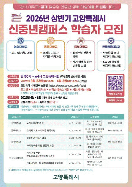 [NWS¹æ¼Û=Çѽ¸ñ ±âÀÚ]°í¾çƯ·Ê½Ã´Â ¡®2026³â °í¾ç½Ã ½ÅÁß³âÄ·ÆÛ½º¡¯ »ó¹Ý±â ±³À°°úÁ¤ ÇнÀÀÚ 180¸íÀ» ¿À´Â 3¿ù 23ÀϺÎÅÍ ¸ðÁýÇÑ´Ù. ½ÅÁß³âÄ·ÆÛ½º´Â ¸¸ 50~64¼¼ÀÇ °í¾ç½Ã¹ÎÀÌ ÀλýÀÇ 2¸·À» Àç¼³°èÇÒ ¼ö ÀÖµµ·Ï °ü³» ´ëÇаú ¿¬°èÇØ Áö¿øÇÏ¡¦