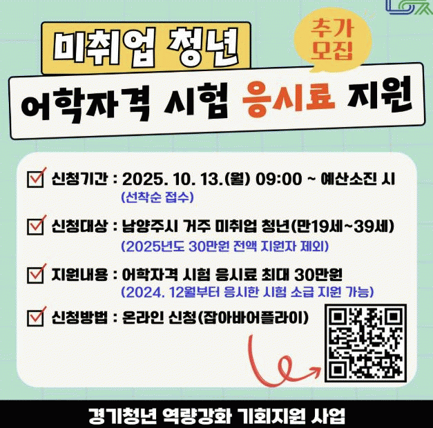 [»çȸ] ³²¾çÁÖ½Ã, ¹ÌÃë¾÷ û³â ´ë»ó ¾îÇС¤ÀÚ°Ý ½ÃÇè ÀÀ½Ã·á Áö¿ø Ãß°¡¸ðÁý |2025. 10.02