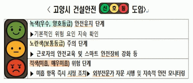 [NWS¹æ¼Û=Çѽ¸ñ ±âÀÚ]°í¾çƯ·Ê½Ã°¡ °ü³» °Ç¼³°ø»çÀåÀÇ ¾ÈÀü°ü¸®¸¦ °­È­Çϱâ À§ÇØ ¡®°Ç¼³¾ÈÀü ½ÅÈ£µî¡¯À» µµÀÔÇϰí, ¾ÈÀü°ü¸® ¿ì¼ö °Ç¼³ ÇöÀåÀ» ¼±Á¤¡¤È®»êÇÏ´Â Á¤Ã¥À» º»°Ý ÃßÁøÇÑ´Ù. ½Ã´Â °Ç¼³ ÇöÀåÀÇ À§Çè ¿äÀÎÀ» »çÀü¿¡ Á¡°ËÇÏ°í ¾È¡¦