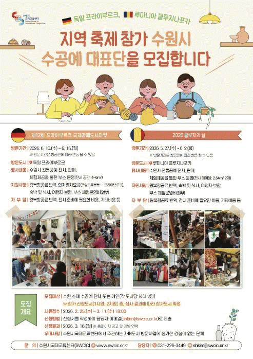 [NWS¹æ¼Û=Çѽ¸ñ ±âÀÚ]¼ö¿ø½Ã±¹Á¦±³·ù¼¾ÅÍ´Â Àڸŵµ½Ã µ¶ÀÏ ÇÁ¶óÀ̺θ£Å©¿Í ·ç¸¶´Ï¾Æ Ŭ·çÁö³ªÆ÷Ä« Áö¿ª ÃàÁ¦¿¡ Âü°¡ÇÒ ¼ö¿ø½Ã ¼ö°ø¿¹´ëÇ¥´ÜÀ» 3¿ù 11ÀϱîÁö ¸ðÁýÇÑ´Ù. ´ëÇ¥´ÜÀº ¡®Á¦12ȸ ÇÁ¶óÀ̺θ£Å© ±¹Á¦Àڸŵµ½Ã¸¶ÄÏ¡¯°ú ¡®2026 Ŭ·ç¡¦