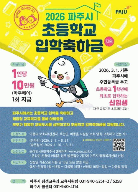 [»çȸ] ÆÄÁÖ½Ã, ÃʵîÇлý »õ Ãâ¹ß ÀÀ¿ø! 2026³â ÀÔÇÐÃàÇÏ±Ý 10¸¸ ¿ø Áö±Þ °³½Ã |2026. 02.27