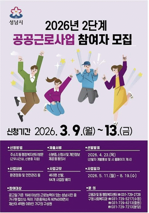 [NWS¹æ¼Û=Çѽ¸ñ ±âÀÚ]¼º³²½Ã´Â ¿À´Â 3¿ù 9ÀϺÎÅÍ 13ÀϱîÁö ¡®2026³âµµ 2´Ü°è °ø°ø±Ù·Î»ç¾÷¡¯ Âü¿© Èñ¸ÁÀÚ 463¸íÀ» ¸ðÁýÇÑ´Ù. ¼±¹ßµÈ Âü¿©ÀÚ´Â 5¿ù 11ÀϺÎÅÍ 8¿ù 19ÀϱîÁö ¾à 4°³¿ù°£ ½Ã¹Î³ó¿ø, Æó±â¹°Ã³¸®½Ã¼³, µ¿ ÇàÁ¤º¹Áö¼¾ÅÍ µî 64°³¡¦