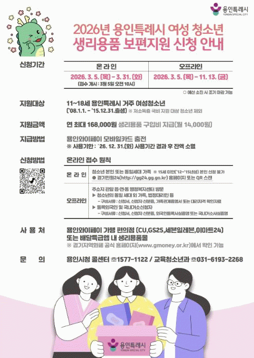 [»çȸ] ¿ëÀÎÆ¯·Ê½Ã, ¿©¼º û¼Ò³â »ý¸®¿ëǰ º¸ÆíÁö¿ø»ç¾÷ ½Åû Á¢¼ö |2026. 03.03