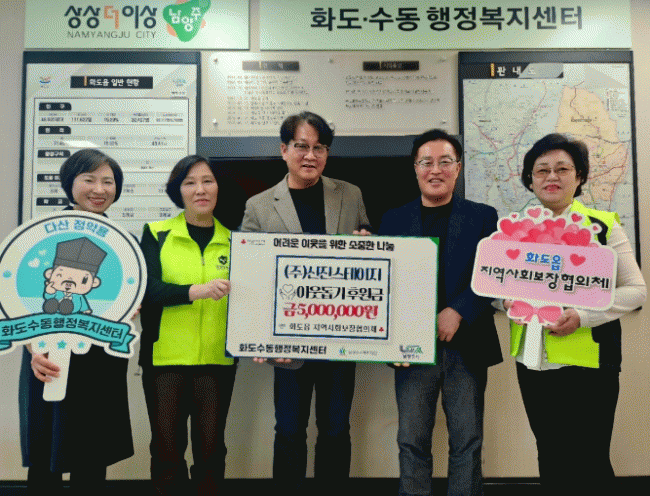 [NWS¹æ¼Û=Çѽ¸ñ ±âÀÚ]³²¾çÁֽô 4ÀÏ °ü³» ¼ÒÀç ±â¾÷ ¢ß½ÅÁø½ºÅ×ÀÌÁö°¡ Ãë¾à°èÃþ Áö¿øÀ» À§ÇÑ ÈÄ¿ø±Ý 500¸¸ ¿øÀ» È­µµÀ¾ Áö¿ª»çȸº¸ÀåÇùÀÇü¿¡ ±âŹÇß´Ù°í ¹àÇû´Ù. À̹ø ±âŹÀº °æ±â ħü¿Í ¹°°¡ »ó½Â Àå±âÈ­·Î °æÁ¦Àû ¾î·Á¿òÀ» °Þ´Â Áö¡¦
