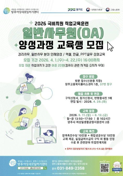 [»çȸ] 2026³â ¾çÁÖ¿©¼º»õ·ÎÀÏÇϱ⼾ÅÍ 'ÀϹݻ繫¿ø(OA) ¾ç¼º°úÁ¤' ±³À°»ý ¸ðÁý |2026. 03.26