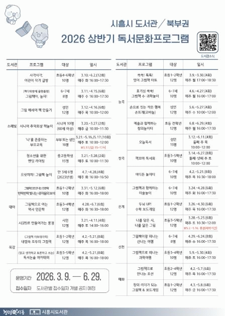 [»çȸ] ½ÃÈï½Ã ºÏºÎ±Ç °ø°øµµ¼­°ü, »ó¹Ý±â µ¶¼­¡¤¹®È­ üÇè ÇÁ·Î±×·¥ 'dz¼º' |2026. 02.12