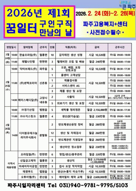 [NWS¹æ¼Û=Çѽ¸ñ ±âÀÚ]ÆÄÁֽô Áö¿ª ³» ±¸Á÷ÀÚ¿Í ±¸Àαâ¾÷ °£ÀÇ ½ÇÁúÀûÀÎ Ãë¾÷¡¤Ã¤¿ë ±âȸ¸¦ Á¦°øÇϰí Áö¿ª °í¿ë Ȱ¼ºÈ­¸¦ µµ¸ðÇϱâ À§ÇØ 2026³â Á¦1ȸ ¡®±¸ÀΡ¤±¸Á÷ ¸¸³²ÀÇ ³¯¡¯À» ¿À´Â 2¿ù 24ÀϺÎÅÍ 26ÀϱîÁö 3Àϰ£ ÆÄÁÖ°í¿ëº¹ÁöÇ÷¯½º¡¦