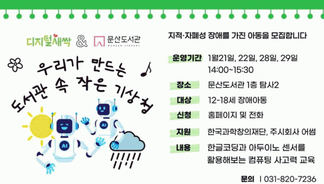[NWS¹æ¼Û=Çѽ¸ñ ±âÀÚ]ÆÄÁֽà ¹®»êµµ¼­°üÀº Çѱ¹°úÇÐâÀÇÀç´ÜÀÇ ¡®µðÁöÅлõ½Ï¡¯±³À°Áö¿ø »ç¾÷ÀÇ ÀÏȯÀ¸·Î, ÁöÀû¡¤ÀÚÆó¼º Àå¾Ö ¾Æµ¿À» À§ÇÑ ÀΰøÁö´É ±³À° ÇÁ·Î±×·¥ ¡®¿ì¸®°¡ ¸¸µå´Â µµ¼­°ü ¼Ó ÀÛÀº ±â»óû¡¯À» ¿î¿µÇÑ´Ù. À̹ø ÇÁ·Î±×·¥Àº¡¦