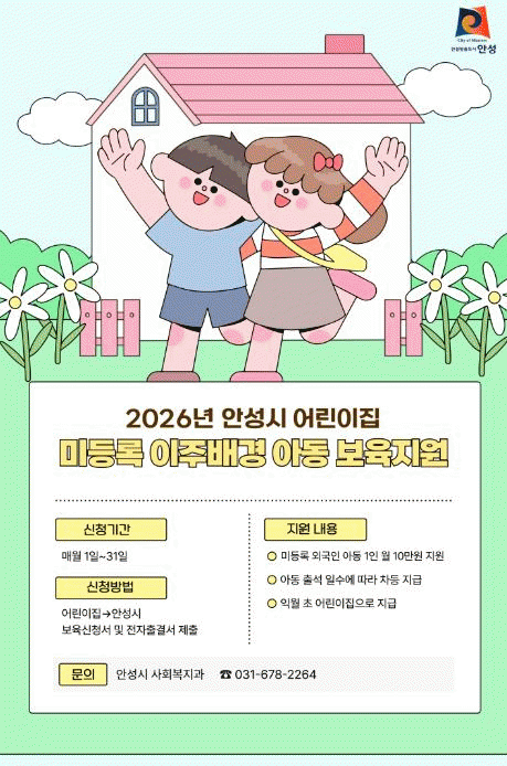 [NWS¹æ¼Û=Çѽ¸ñ ±âÀÚ]¾È¼º½Ã´Â 2026³âºÎÅÍ ¾î¸°ÀÌÁý¿¡ ´Ù´Ï´Â ¹Ìµî·Ï ¿Ü±¹ÀÎ(ÀÌÁÖ¹è°æ) ¿µÀ¯¾Æ¿¡°Ô ¿ù 10¸¸¿øÀÇ º¸À°Áö¿ø±ÝÀ» Áö¿øÇÑ´Ù°í ¹àÇû´Ù. À̹ø »ç¾÷Àº Áö³­ÇØ 11¿ù ÁøÇàµÈ °æ±âµµ ¼ö¿äÁ¶»ç¿¡¼­ ¾È¼º½Ã°¡ º¸À° »ç°¢Áö´ë¿¡ ÀÖ´Â ¡¦
